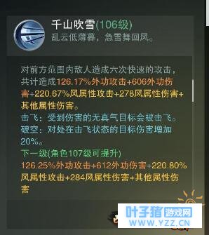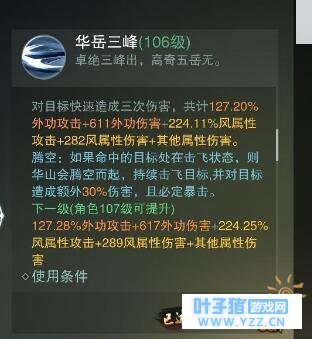 直接总结吧:貌似核心却不尽如人意的花瓶技能 之所以这么说,我不知道大家上次14号的更新公告看了没有,说是减少千山吹雪的前摇更容易打出暴击,我只想说一句,pvp打的多的华山都知道,就算你吹风吹空对手真气想要接千山加华岳,也很少有成功的,之所以这样是跟千山吹雪的技能动作有关系。 千山吹雪一共有六次攻击其中第一下和最后一下是带击飞效果的,最理想的情况当然是六下打满然后接华岳,然而无语的是第一下到最后一下时间间隔太长,往往就是第一下给人击飞后还没打完别人就跳走了,留你一个人跟瓜一样的跳起下劈。 7.华岳三峰