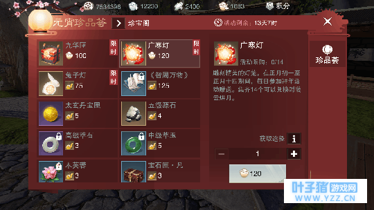 上图是元宵节活动的特卖,是有售卖广寒灯道具的,一个广寒灯120元宝。
