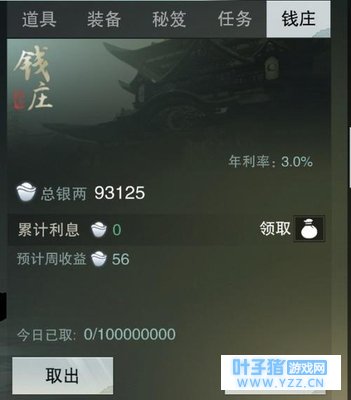 4.每天不用的银币是可以存在包裹第五个里面的钱庄的,每天早上5点会给利息,虽然不多,但是蚊子小也是肉啊。ps:友情提示,每天存满能给8000+银币呢,记得存满哦。哈哈
