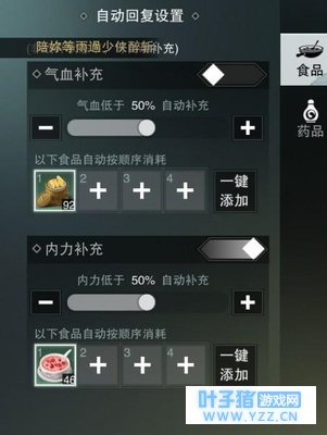 2.食物的补充在角色,气血和内力旁边的+,点开可以补充。ps:注意买铜币的,别买银币的。