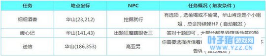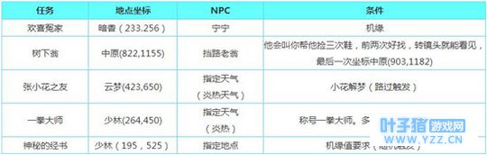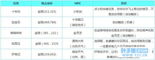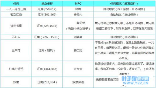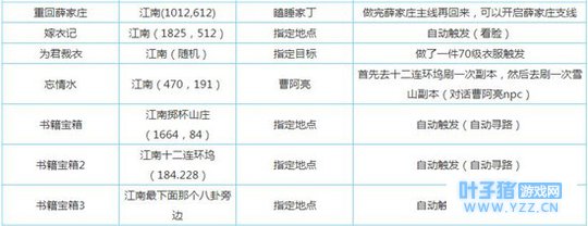 关于奇遇 在信步田间时的一次对话,在街口转角处的一次相撞,甚至是偶然路过的雨天桥下,奇遇会在哪里发生,你又如何料到? 毫不起眼的扫地老翁可能是身怀绝技的世外高人,与之交谈甚欢可能会意外获得秘籍和称号,一不小心撞到则可能瞬间毙命;在江南地图中,部分玩家会接到浪漫的送花任务,而男主苦恋的女主竟然被发现是一位女装大佬,简直让玩家大喊梦碎…… 奇遇:欢喜冤家 地点:暗香(233,256) NPC:宁宁【机缘不够触发不了】 【江南篇】 奇遇:一人一狗走江湖 地点:江南(650,617) NPC:林客 任务概览:你需要找十条狗,自动寻路即可 【江南支线】 支线:暂别江南 地点:江南(301,369) NPC:神秘人 任务概览:支线任务(楼主在他面前飞奔过好几次都没点他) 奇遇:逃学书童 地点:江南(724,1536) NPC:魏无忧(马路中间那个女孩子,有筒子说她路过就有了我忘了我点没点) 任务概览:魏无忧会让你找魏无暇,不是自动寻路,魏无暇在图二的树下,然后找赵婶,赵婶在白天出没 奇遇:细细酒香 地点:华山(23,212) NPC:挖掘就行 任务概览:有选项,选偷喝或不偷喝。华山肯定是个小姐姐,总会持续掉HP 【华山】 奇遇:暖心记 地点:华山(141,43) NPC:出题狂魔瞎眼老三 任务概览:答对十题即可,大部分都是酒馆活动答的题,下面报波答案 奇遇:不归人 地点:江南726,1533 npc:刘婆婆 奇遇:十年功 地点:金陵(311,315) NPC:小和尚 任务概览:点小和尚接任务,他会叫你飞上旁边的楼顶,不是自动寻路 奇遇:树下翁 地点:中原(822,1155) NPC:挡路老翁 任务概览:他会叫你帮他捡三次鞋,前两次好找,转镜头就能看见,最后一次坐标中原(903,1182) 奇遇:三朵花 地点:江南 NPC:姜二妞 任务概览:不是点npc就会触发的,在路上跑跑触发,一共有三天,每天帮送花,最后一天会让你告诉姜的发小其实二妞是个女装大佬,你要选择告诉或者不告诉 奇遇:帮高亚男给胡铁花送信 地点:华山(186,353) NPC:高亚男(不点npc,路过门口就能触发) 任务概览:你需要选择拆信看或者不看,告诉胡铁花或者不告诉 奇遇:未知 地点:华山(185,222) NPC:神秘人 任务概览:无法触发哪位触发求告知 奇遇:喵喵咪咪 地点:金陵385,232 npc:金灵芝 任务概况:在金陵鸡鸣寺后面走会听到猫叫,然后闻声找到金灵芝 奇遇:打钱的诅咒 地点:江南(1461,468) NPC:朱文圭 任务概览:我路过他很多次,后来跑商路过触发了。谨慎选择。我选不给钱,没称号,还被抓了。 奇遇:忘了 地点:江南(733,384) NPC:奴隶旁边 任务概览:选择题需要选买奴隶,不买没称号。 支线:重回薛家庄 地点:江南(1012,612) npc:瞌睡家丁 任务概览:做完薛家庄主线再回来,可以开启薛家庄支线 奇遇:捡宝石 地点:金陵(469,784)的十字路口 npc:无 触发条件:看脸 任务概览:反正小编正常骑小马跑过就被宝石砸中,真是看运气。 为歌狂(516,689),西洋记(470,737),马路边还有个日本人认错人奇遇【天枫十四郎和金辉姬】 奇遇:未知 称号:吃瓜侠 坐标:406,1535 吃西瓜奇遇应该是在这里接的,炎热天气,不是这里就是酒馆旁的大树。(点活动可自动寻路到酒馆) 重点概览:选择题,老婆婆叫你买西瓜,自动寻路到瓜摊,一定要多抱几个瓜不然该任务会夭折。 奇遇:嫁衣记 地点:江南1825,512 触发条件:自动触发看脸 奇遇:张小花之友 触发地点:云梦(423,650)天气炎热 NPC:路过触发 任务概览:小花解梦,触发靠脸。 奇遇:一拳大师 地点:少林(264,450) 天气:炎热 npc:跑动触发 任务概览:称号一拳大师,需要多逛几圈,没触发换线试试 奇遇:为君裁衣 地点:江南 触发条件:做了一件70级衣服触发 奇遇:忘情水 地点:江南470,191 npc:曹阿亮 触发条件:对话曹阿亮npc 任务详情:首先去十二连环坞刷副本,刷完之后刷雪山副本,只能获得一点经验和2万铜钱。 奇遇:奸商记 地点:金陵(339,692) npc:跑动触发 天气:炎热、湿 任务概览:奸商讹诈你,让你选择抓他报官还是放了他,选择报官就对了,报官可以增加5点正义和8能力点。 奇遇:神秘的经书 地点:少林195,525 触发条件:随机触发,但是跟机缘值有关系 书籍宝箱 地点:江南掷杯山庄1664,84 书籍宝箱2 地点:江南十二连环坞184,228 书籍宝箱3 地点:江南最下面那个八卦旁边 以上就是楚留香手游奇遇任务攻略大全所有奇遇完成方法。 |