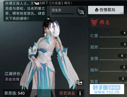 不同的命格也会解锁不同的面谱,相由心生 例如,当玩家罪恶值足够高的时候,将会面临坐牢的风险。当然,游戏中不止于此,玩家在人物的性情趋向上,同样有着正义和邪恶之分,同时有着仁慈与好战、超然与入世、多情与无情、随和与桀骜、耿直与玲珑等多重属性来判定正义或是邪恶。玩家在游戏中的每一步选择影响着接下来的发展,性情不同,遭遇也不大一样。
