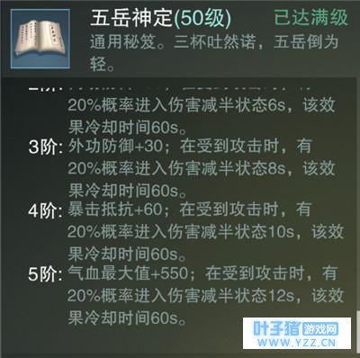 被攻击时有几率进入伤害减半状态持续N秒! 满级的五岳神定 伤害减半持续12秒! 明玉功