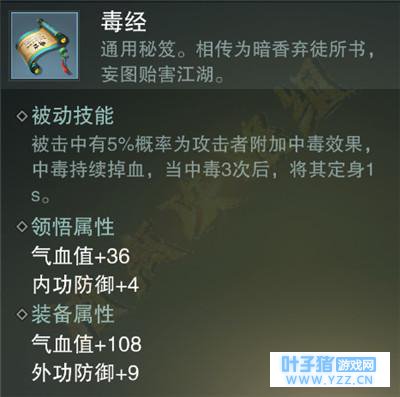 这个PVP神技 对方攻击你有一定几率中毒,当中毒层数达到3次定身一秒。 这个定身非常非常容易触发!!! 而且毒经会大量增加血量 五岳神定