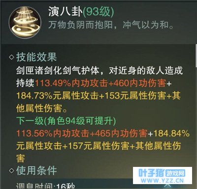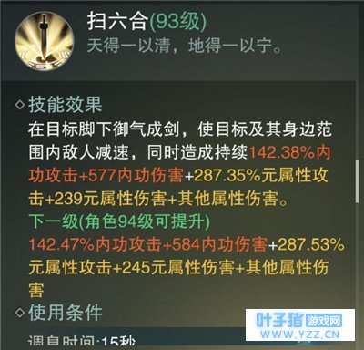 演八卦:使用后剑气护体,对近身敌人造成持续伤害,搭配扫六合使用群怪利器,PK中敌人近身后也可以使用,会造成僵直,但是要特别注意和尚开解控贴上来这时候不能用,否则会给对方回复大量血。 扫六合:远距离主要输出技能之一,释放后会位移至目标脚下造成多段伤害和减速,释放完毕后会回到原位置,群怪打人减速都是利器。大侠喜欢闪过去后立马闪避位移到对方背后去后接幻四象,闪避可以打断技能持续时间,但是伤害不减。