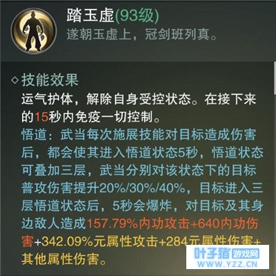 下面介绍武当其他技能: 踏玉虚:核心技能之一的解控技能,并且使用后15秒内免控,悟道状态是永久存在,只要使用技能就能是目标获得该状态,每层使普攻伤害增加,3层后爆炸。 鹤亮翅:核心技能之二的控制技能,眩晕范围内2个敌人5秒并造成2段伤害,缺点是后摇很长至少2秒,所以通常使用闪避位移来打断后摇,可以在对方眩晕时间内用出更多技能,注意该技能的三不打,不打套盾的华山,解控后的和尚以及飞起来的云梦。