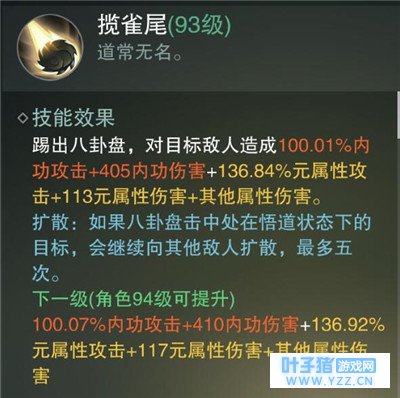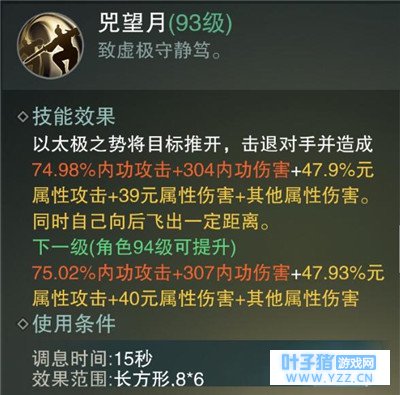 揽雀尾:远程群体输出技能之一,如果目标在悟道状态下,踢出的八卦盘会弹向其他最多5个目标,副本中一般在其他群体技能释放后使用;PK中远距离的消耗技能首选。 兜望月:武当的控制技能之二,推开近身敌人,释放距离较短,副本中不太好用,因为远程输出站的较远,需要靠近boss才能释放;PK中作用就是保命啦。