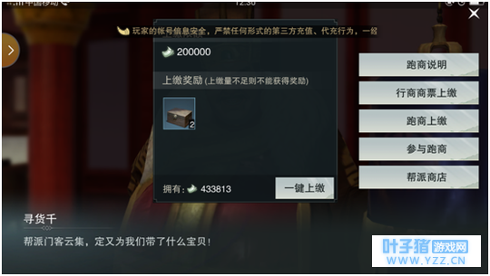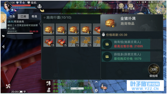 为出帮后,严州鼓-十二连环坞—雪卢书院--施家庄-郑怀山庄-施家庄(打底27W宝钞上限不定的一条跑商线) 一般跑完了也就15分钟不到(用轻功可以减少时间) 一般跑商商品左上角写着值这个字的,大多数商人收购价都不会很低(商人级3级有个技能铜钱眼可以看到最低收购价(也就是亏本价)别去那里卖就好) 刚开始跑商如何买商品 以下是商品优先级 商品价格高并且带有值字(红货)>商品价格高无值字(半红货)>商品中等价格带有值字)(中等普货)>商品中等价格货(普货)>商品价格低值钱货>商品价格低但是没值字 总之(选价格高的买先不会亏) 下面我们开始跑商 严州鼓(火腿必买) 十二连环坞(江屯必买) 雪卢书院(砚台必买) 施家庄(金猪铺满)