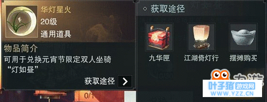 兑换时间:2018年3月2日-3月15日 集齐30盏【华灯星火】即可兑换【灯如昼】坐骑。 华灯星火获得方法:通过倚灯行活动获得,也可以通过开启九华匣获得。