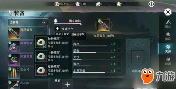 点击洗练可以看到洗练相关 ,先不要追求洗练属性 先把每件装备洗练一遍, 后面全部装备都洗练过再洗你想要洗的属性,(注:萃石用来洗练 ,萃玉可以锁定你想要锁定的洗练属性 洗练时锁定属性不变,)。 3、行当