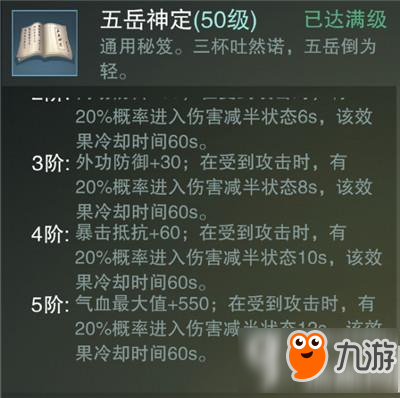 被攻击时有几率进入伤害减半状态持续N秒! 满级的五岳神定 伤害减半持续12秒! 明玉功