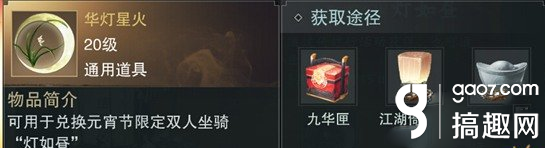 兑换时间:2018年3月2日-3月15日 集齐30盏【华灯星火】即可兑换【灯如昼】坐骑。 华灯星火获得方法:通过倚灯行活动获得,也可以通过开启九华匣获得。 |