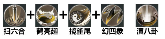 PVE 1:群小怪。一般副本中都会有一些小怪挡路,可以直接用扫六合+鹤亮翅+揽雀尾+幻四象,如果小怪还没有死完,可以用演八卦。