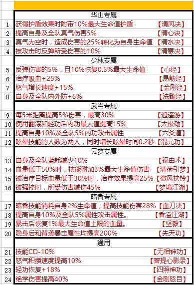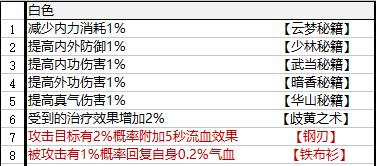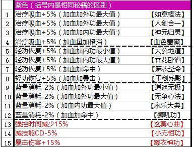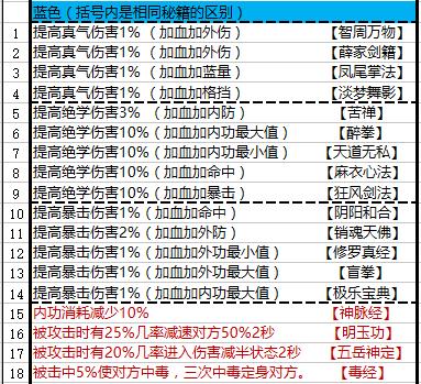 由游戏里面的说明我们可以知道,平时一般的秘籍领悟了带在身上只有 领悟属性 ,升到50级秘籍提高的领悟属性也非常有限。秘籍主要作用是被动技能+装备属性+进阶属性,如果纯领悟而不装备所带来的属性还不如点培元带来的属性高。 正如我前面所列表那样,72本秘籍大部分都是属性型秘籍(上面列表灰色的秘籍),例如【武当秘籍】的提高内伤1%那种;而装备的秘籍最好是 功能性秘籍 (上面列表红色的秘籍),例如【毒经】的中毒流血定身,因为功能性秘籍装备后,带来的是多一个技能,一个技能对于PVP往往是决胜负的关键。