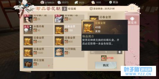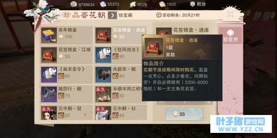 【活动五】贺金陵-花魁竞游春 活动时间:3月23日更新后-4月13日更新前 活动内容:活动期间每晚10点,点香阁特别邀请当日创收最高的花魁,于金陵举办隆重的花街游行。 届时,少侠可以参与金陵花街游行,与游行队伍进行各种互动,同时还能获得不菲的奖励呢。 活动奖励挺丰富的,许愿道具的来源;就是晚上十点稍晚了些。 【活动六】百花市-珍品荟花朝 活动时间:3月23日更新后-4月13日更新前 活动内容:活动期间,花朝节特卖商城将上架华年锦盒(概率获得特技谱、秘笈残页等珍稀道具)、花签锦盒逍遥(开启后获得随机数额银两,及1个随机花名签·逍遥)、花签锦盒江湖(开启后获得随机数额银两,及1个随机花名签·江湖)等商品。其中两种花签锦盒每日各限购1个,想要收集花签的少侠不要错过哦。 开启华年锦盒,必定获得一枚“花神绣”,参与满庭芳和双灯趣活动也将获得一定数量的“花神绣”。“花神绣”可用于兑换永久双人马鞍·共韶华/踏莎行、时装·云中鹤、挂件·水墨丹青、衣柜主题装饰、势力秘笈、金色秘笈匣等珍稀道具。 拼手气的时候又到啦,花神绣可以兑换双人马鞍、挂件、势力秘籍、金色整本秘籍等道具,前2本金色秘籍只要150个花神绣,之后买就翻倍了,花神绣每天任务可以获得3个,20天可以获得60个,其他的只能开箱子啦;还可以元宝购买礼盒获得银子和花签,这没什么意思觉得。