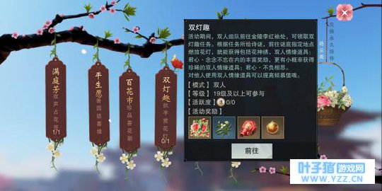 【活动三】花间醉-贵客邀美酒 活动时间:3月23日更新后-4月13日更新前 活动内容:活动期间每晚6点、8点、10点开始,部分江湖人士有可能在许愿树下出现,只是他们行色匆匆,短暂停留10分钟左右便再次消失在茫茫江湖,若少侠欲与之一见,千万不要错过哦。 少侠可以与他们把酒临风,亲耳聆听他们在花朝节的感悟,相谈甚欢的话这次会面可能在系统频道昭告江湖哦。同时,少侠还会收获他们赠予的专属花名签·江湖,随时聆听专属语音,品味他们与花的因缘。 江湖传闻,收到同心锁数量越多的江湖名士出场机会越高哦。 每天固定时间江湖人士出现十分钟,玩家可以赠送他们玉团春共饮,获得NPC的节日问候花签。在愿望树获得的同心锁越多的NPC出场几率越高,每天别忘了去参加哦。 【活动四】双灯趣-执手赏花灯 活动时间:3月23日更新后-4月13日更新前 活动内容:活动期间,只要两位少侠组队前往金陵李红袖处,即可领取双灯趣任务。 根据任务所给诗谜,前往谜底指定地点燃放花灯,就能获得包括双人情缘道具:君心·念念不忘在内的丰富奖励,更有小概率获得珍稀的双人情缘道具:君心·不负相思。 对他人使用双人情缘道具可以提高倾慕值,还能获得专属成就和称谓哦。良辰美景奈何天,赏心悦事谁家院?愿诸位少侠都能与心上的人儿执手相伴,莫辜负春色如许。 本活动需要2个人组队领取,很多人误以为要2和花签一样的才能做不知从哪听到的谣言哈,完全没影响的。队长接取任务后会获得灯谜提示,玩家根据提示去谜底地点放灯笼即可完成。猜不出来可以把灯谜发到世界、帮派及门派频道求助,限时1个小时完成,也可以任务栏点作弊,2个人都同意后直接显示谜底,但是奖励会降低。完成任务后会获得1个花神绣和蓝色的念念不忘情缘道具,低概率有橙色的道具;对目标使用后全服通告哦。灯谜目前大侠知道圣人道大能亦博是夫子庙, 风吹柳花满店香是雁来客栈。