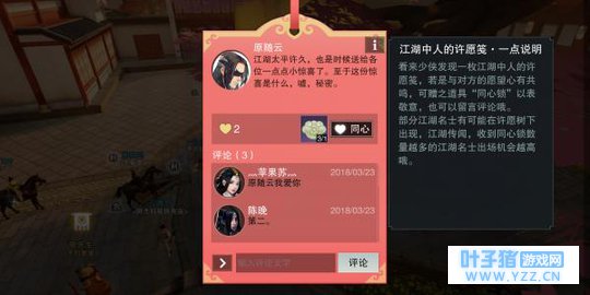 【活动二】平生愿-善因结善缘 活动时间:3月23日更新后-4月13日更新前 活动内容:活动期间,时值春日的金陵三生树将挂满许愿笺,作为许愿树开放给广大少侠许愿、祈福和游赏。少侠可以消耗“红纸笺”进行许愿,也可以领取其他少侠发布的愿望,帮助他人还愿。还愿虽然没有丰厚的奖励,但因此结下的善缘,也许会给少侠带来更美丽的相遇呢? 与此同时,树上也会出现众多江湖人物的许愿笺,他们都许下了什么心愿呢?各种小秘密等待少侠去发现。少侠若是与对方的愿望心有共鸣,可赠之道具“同心锁”(可通过满庭芳、贺金陵等途径获得)以表敬意。 活动期间可以到三生树下和宋甜儿对话自己许愿和查看他人的愿望,每天只有10次刷新的机会,大家可以选择喜欢的NPC的愿望赠送同心锁增加该NPC在晚上的花间醉出场几率,每个同心锁增加1点同心值。也可以查看玩家的愿望,接取他们的心愿并评论留言,发布人接受你的留言后愿望完成,还愿活动没什么奖励,纯粹是增加大家了解的途径哈,自己发布的和接取的愿望可以勾选与我相关的愿望查看,已经完成的愿望可以在左上角选择缘分已结查看。自己发布愿望需要红纸笺道具,来源于晚上10点的贺金陵活动,第一次发布愿望免费。