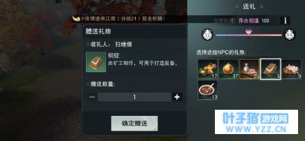 原来,尽管是隐世高人的扫地僧,也是非常“现实”的,一个铜锭就能增加100好友度。虽然说,扫地僧不能成为战友,但是在江湖上行走,多一位隐世高人做朋友,怎么说都是赚了啊!