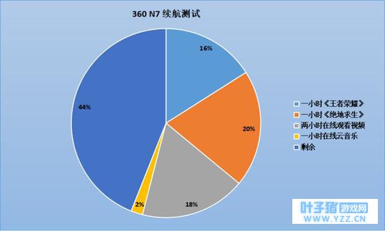 接下来就测试一下 360 N7 的续航情况,基本屏幕亮度维持在 50% 左右,并戴着有线耳塞的状态下进行。实测玩了一个小时的 《王者荣耀》 基本耗电为 16%,一小时 《绝地求生:刺激战场》 耗电为 20%,然后两小时 bilibili 在线视频关闭弹幕耗电为 18%,然后再关闭屏幕一小时在线云音乐耗电为 2%,经过了这高强度的五小时测试后仍然剩余 44% 电量。可以说这 5000 毫安时大电池确实非常厉害,再好的续航优化都不如真正的大电池靠谱。如果你只打算用来玩 《王者荣耀》,预计可以连续玩六个小时。