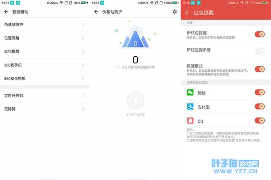 在智能辅助菜单里面还有伪基站防护,在附近有伪基站信号的时候会给你提醒。当然还有现在少不了的红包提醒,基本上已经覆盖了目前三大社交应用的提醒,还能在解锁状态下自动跳转到收红包界面,非常智能。