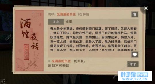 来往的客人留下的,可能是江湖传闻,可能是情感的秘密,可能是最美的江湖风景或者最好听的声音。有的玩家记录自己的甜蜜日常,也有玩家将自己脑海中的江湖故事写下来,但是500字似乎不足以发挥,足足写了好几段。 少侠们不妨来酒馆里说出自己的故事,或许会收获难得的江湖知音!