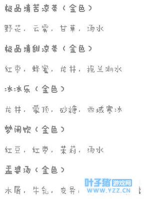 消夏茶-金色 甘草、桂花、云雾、西域【三种茶叶】 如玉茶-金色 1、牛乳、蜂蜜、人参、古北 2、牛乳、蜂蜜、人参、挽兰 极品奶茶-金色: 牛奶、蜂蜜、茶叶、热汤 极品花茶-金色 茉莉、桂花、蜂蜜、江南山泉 天山雪乳-金色 牛乳、蜂蜜、沙滩、西域寒冰 极品甘甜凉茶-金色 桂花、龙井、砂糖、江南山泉 极品溢补凉茶-金色 红豆、红枣、蜂蜜、挽兰湖水 本文来源:UC头条,作者:,转载请注明来源。 |