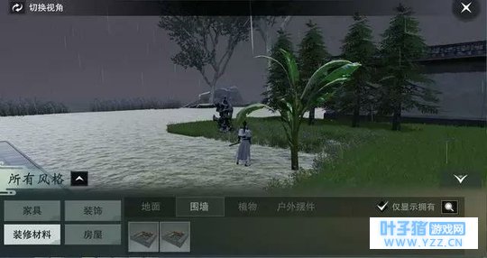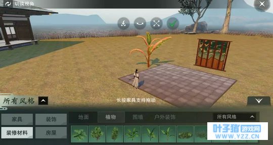 然后屋外还可以再布置布置,比如要不要在门口铺块地板?再种点草皮、小树?