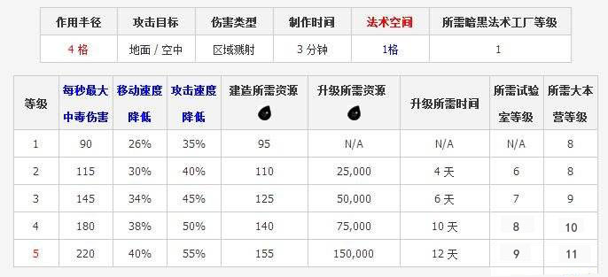 部落冲突毒药法术升级所需时间资源详细