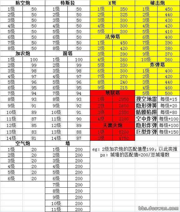 12月25日更新:较上个版本法塔电塔微调,欢迎讨论交流 借用网友整理的老版本防御匹配值表格,本人对比后得出在新版中只有法塔和电塔作了调整。 了解更多相关信息,请前往http://sy.yzz.cn/coc/ [编辑:二蛋]
