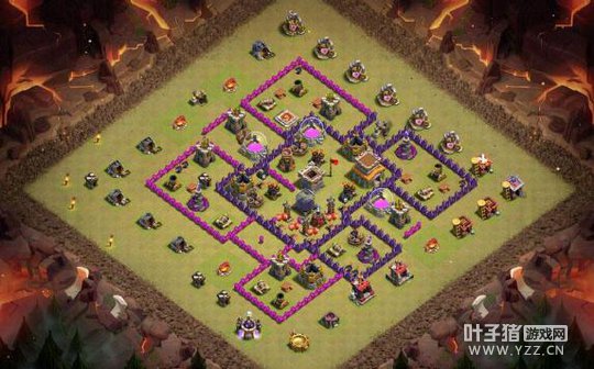 小编给大家带来了部落冲突八本城堡中置阵推荐 部落战布阵技巧,想了解更多部落冲突手游攻略,敬请关注叶子猪部落冲突专区。 本人喜欢难引援的阵型,今天这个阵型依然是一个城堡中置阵。引援范围全部在防御之内,除非打掉至少一个建筑,否则无法引援。迫击炮覆盖四角的位置防止偷摧毁率。防空用各两个厚血建筑和黑炸弹保护。6点处的空格可以分开龙球,让气球吃掉4个红炸弹。4点半和10点半处有4空格,让石头和胖子跑偏。武神皮卡有大概率出外圈清边。援军推荐:防武神填龙宝黑球,防胖子填法师,放猪填法师武神。