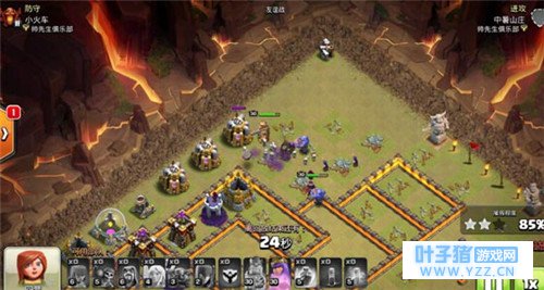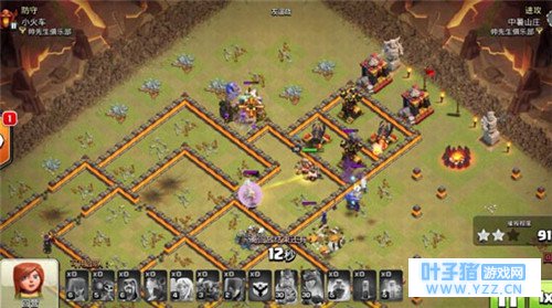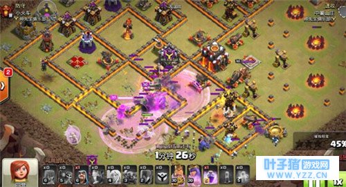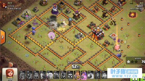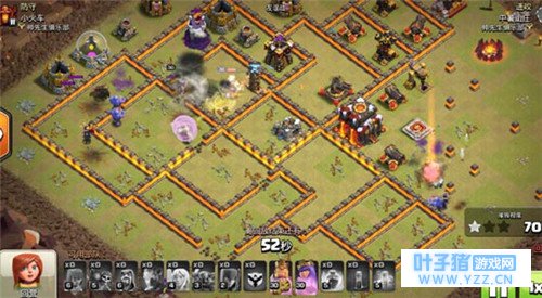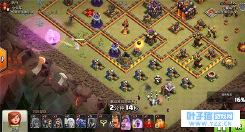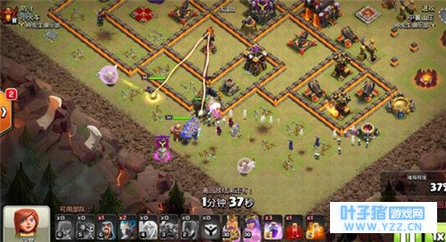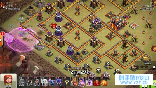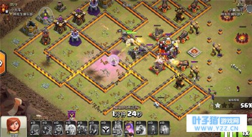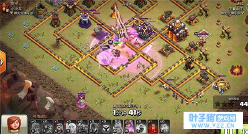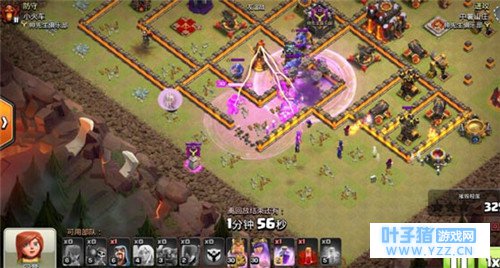 这里面的技巧就是 ,天女滑步,清理一边,然后再天女走的方向上,女巫断便清理外侧,大部队汇合女王进镇。 第一步,天女下去。 一个法师辅助清理厚血建筑。 角落里的小零碎,安排个弓箭手清理。节省时间。 30级打40级女王还是要万分小心的,第一时间扔下狂暴。这个狂暴 不仅要照顾杀女王,还要照顾下一步前行方向,效果利用最大化!