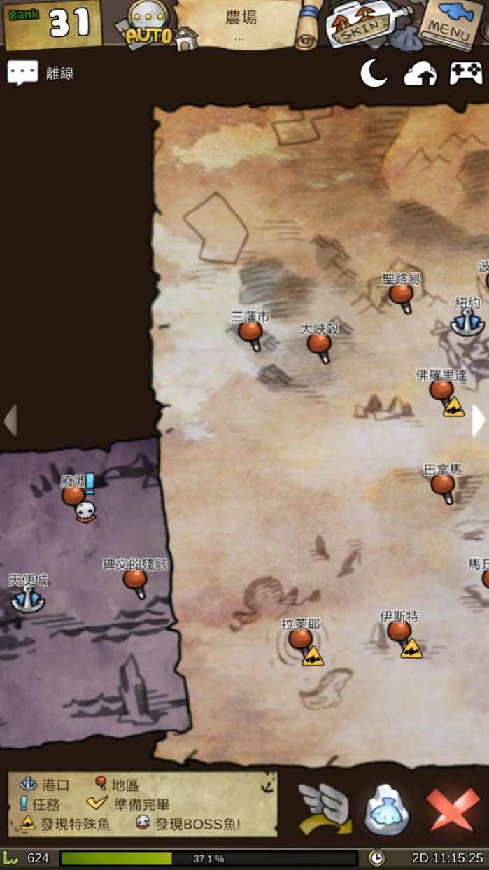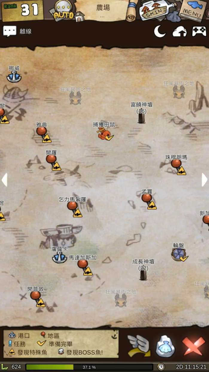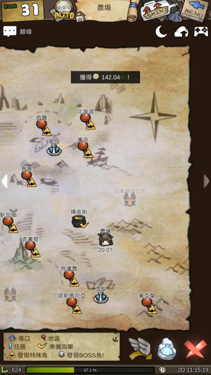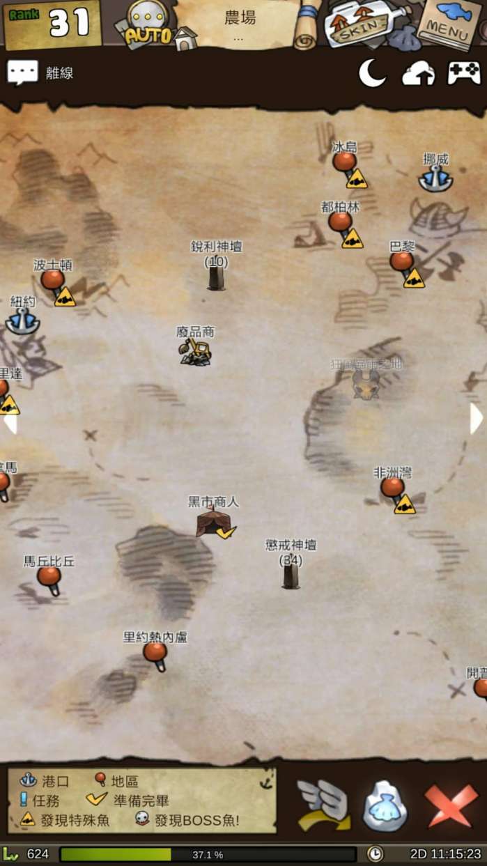 非常大的地图,每一个特殊地点都有独有的boss鱼和稀有鱼!细心的小伙伴有没有发现,这个地图就是真正的世界地图哦,制作组最用心的地方就是每一个特殊地点都有代表物!