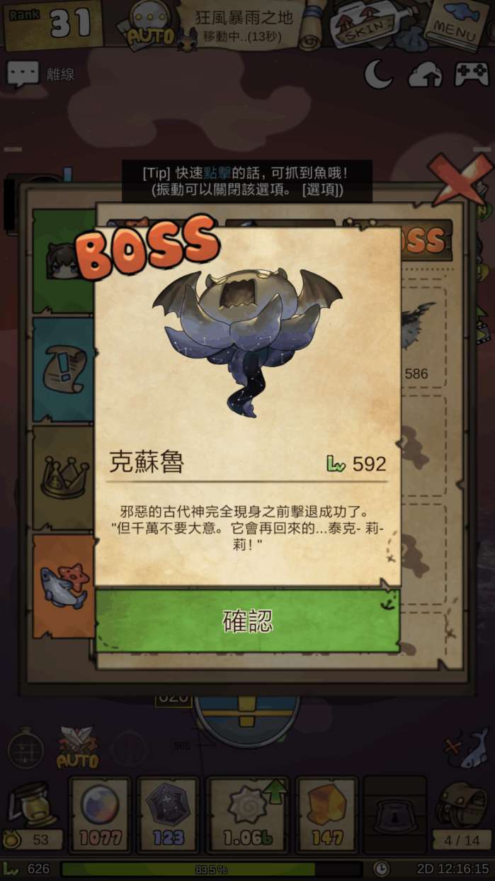 出现感叹号后,点击屏幕。鱼就飘到水面上,然后进入battle模式,咱们要做的就是疯狂点击屏幕。