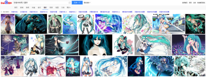 百度图片搜索的同人画作数不胜数 与此同时,网络上也开始涌现出许多初音未来的同人作品,不管是翻唱歌曲、舞蹈鉴赏、同人画作等等,更甚还诞生了原本为初音未来制作3D模型自由舞蹈的MikuMikuDance(简称MMD)这款往后为诸多3D创作提供免费支持的动画软件。