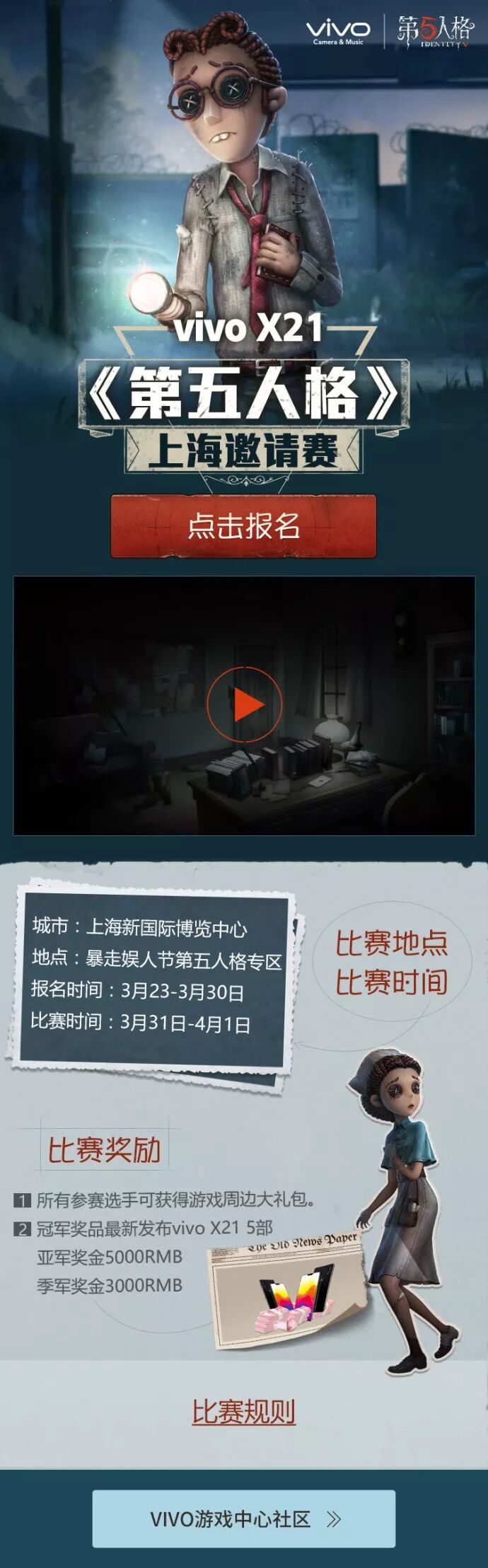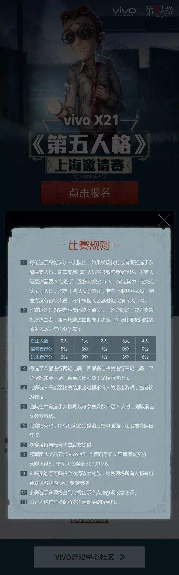 由于线下赛有一定的局限性,所以我们会在后台根据大家填写的情况(包括游戏时长,游戏段位,地理位置)进行筛选,最终选出8支队伍参与比赛,本次冠军团队奖励是5台 vivoX21 ( #全面屏手机!全效运行第五人格不费劲!帧数稳定画面效果棒!!!用过的都说好!!!# ) 详细的比赛规则大家可以看图