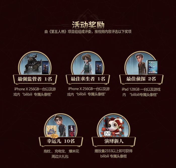 1.活动投稿时间为: 2018 年 4 月 29 日至 5 月 20 日。 2.本次活动仅支持原创作品,微改、代投、搬运、转载类均不能参加。 3.视频内容限定为游戏题材,风格不限,作品根据题材投稿至游戏区下的 相关分区,投稿时需要选择参加此次活动。 4.活动作品不能使用过往已公开的稿件或删稿重投稿件,且活动作品不能 含有其他平台水印。 5.内容设计相关规定、政策所限制的题材,或使用其他过度猎奇、违规、争 议性等素材的投稿作品将不予通过,请注意含有明显商业推广要素的稿 件不可参赛。 6.关于激励双倍 活动稿件在 5 月 1 日 -5 月 26 日期间的激励翻倍哦 投稿 的UP主需满足激励计划准入门槛,并于投活动稿件前申请参加激励计划 并通过审核。本次活动的激励收益规则,均以激励计划详细规则为准。 7.视频长度请控制在 1 分 30 秒以上, 20 分钟以下。 8活动作品自荐邮箱: nryyb-yx@bilibili.com ,投稿时带上#第五人格 # 的话题, 可以让你的稿件得到更多的展示哦! 9本活动最终解释权归哔哩哔哩动画所有。如有问题可联系 help@bilibili.com