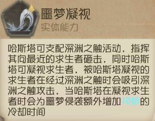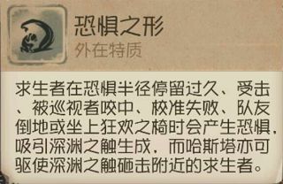 【技能解析】 知己知彼 百战不殆 外在特质【恐惧之形】 ——求生者在恐惧半径内会生成触手。 求生者尽量避免在恐惧半径内停留!