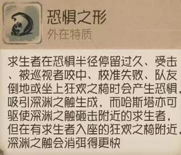 恐惧之形 是被动类型的技能,该特质大体不受哈斯塔主动控制,总是在求生者“犯错”时产生效果,校准失败、受击、队友倒地、队友上椅均会在在身边生成深渊之触。初始阶段的哈斯塔唯一能控制的深渊之触生成手段是求生者保持在警戒半径内会生成深渊之触,这个保持时间大概在 25秒 ,哈斯塔玩家可以在默算这个时间,并准备好控制深渊之触攻击生成深渊之触的求生者。恐惧之形生成的深渊之触不会主动攻击,除非受到哈斯塔其他技能效果的影响,深渊之触可以被快速拆除,哈斯塔玩家一定要警惕求生者靠近 关键位置的深渊之触 。