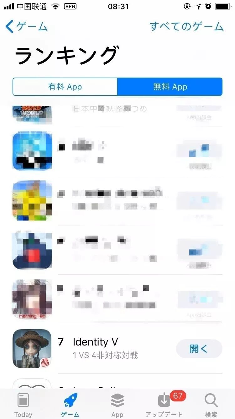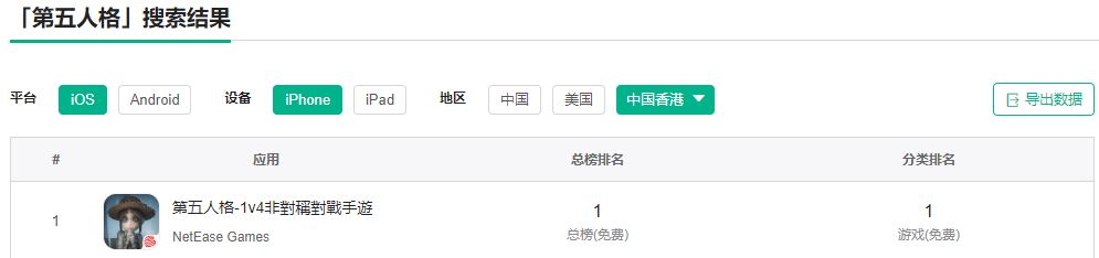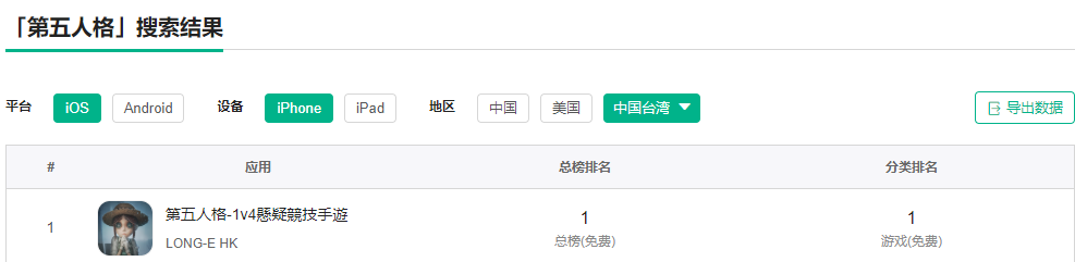 今天我又偷偷去看了一眼榜单~ 发现在我们港澳台地区的App Store总榜上 《第五人格》已经是 第一 了 在日本的免费游戏排行榜上也进了 前十 ~