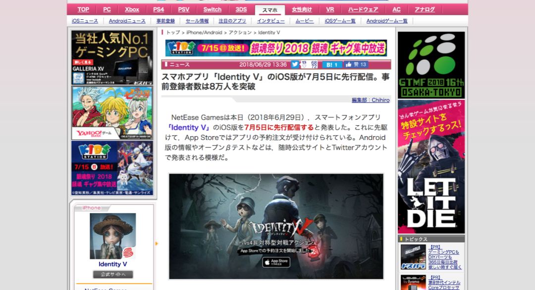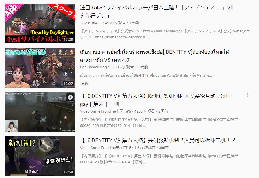 在今天游戏上线之前 Youtube 上以游戏英文名“ Identity V ”为关键词的 视频就已经超过了 500 万部 关于《第五人格》的资讯 也出现在多家海外媒体头条 还有许多海外 up 主也开始创作游戏相关的内容了~ (划个重点:第五人格英文名是 Identity V )