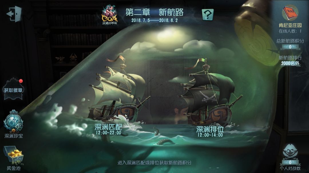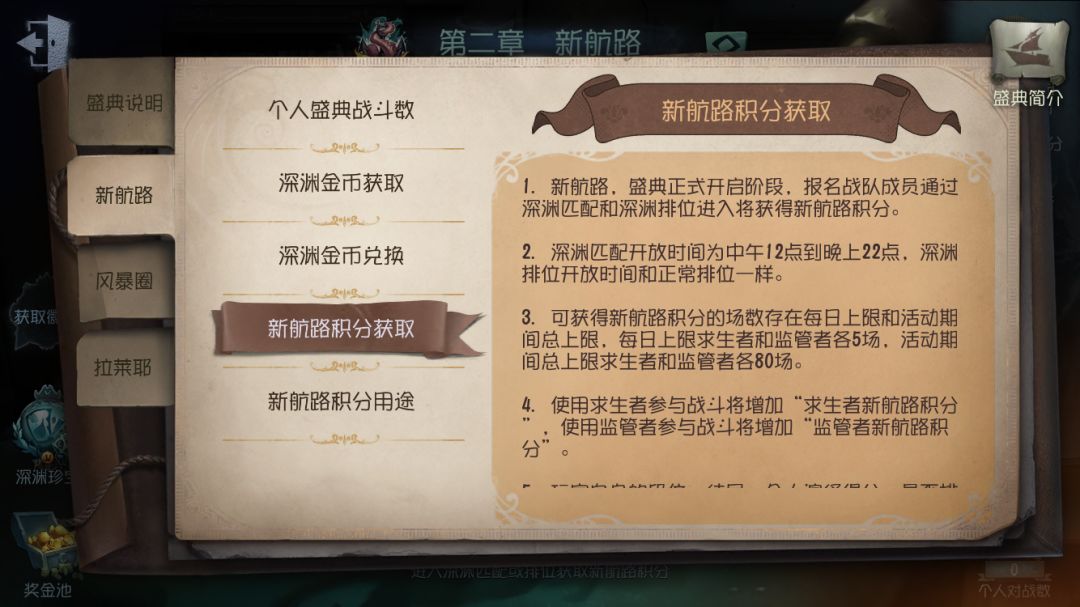 最后,一个小贴士:参加暑期盛典活动的玩家们,记得要从 深渊匹配和深远排位 的入口进入,才会获取新航路积分哦~以及新航路积分的获取是有上限的,大家仔细看活动规则哦!