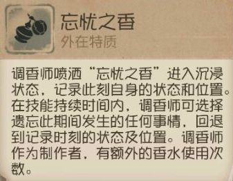 主动技能【忘忧之香】使用后留下红色幻影,5S内再次使用,恢复到第一次使用的状态(包括位置)。冷却时间10秒,每局可用3次。