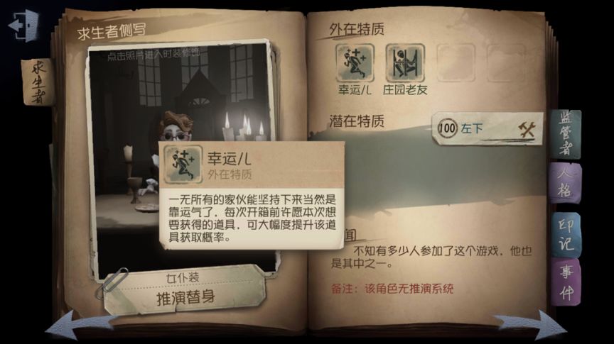 幸运儿本来是第五人格里其他人物的基础模板,但是这次更新的特质使幸运儿摇身一变成为了一个万金油角色!那么今天猫 e 就给大家简单介绍一下新版的幸运儿!