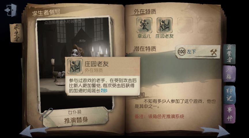 2、 庄园老友 受到攻击后获得的加速时间延长 2 秒,意味着每次受到伤害可以跑的更远,更加容易逃生!