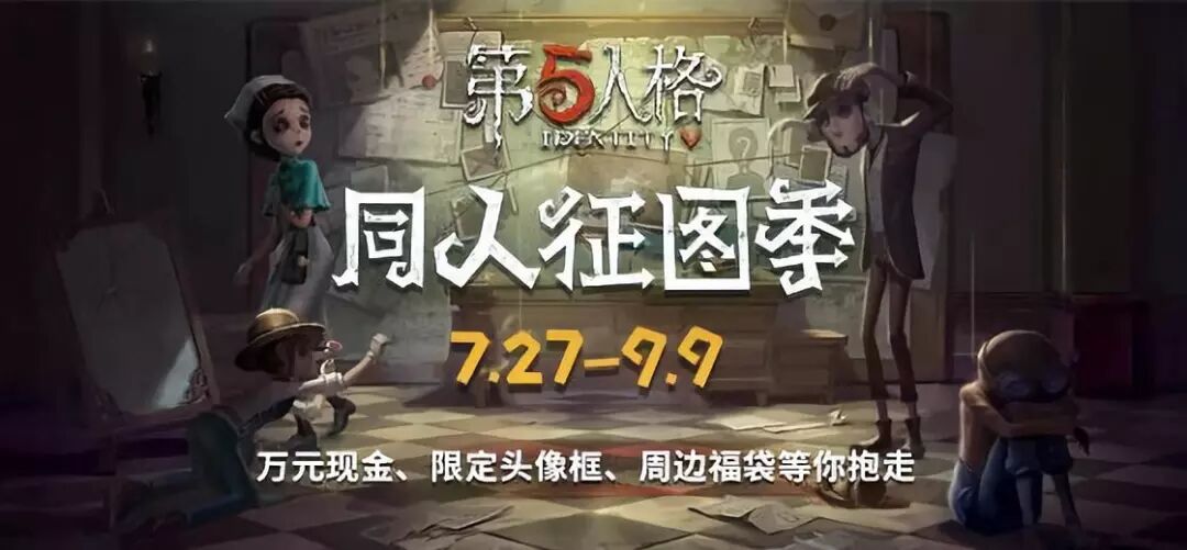 【活动规则】 1、本次活动提交作品时间为2018年7月27日12:00:00—9月9日23:59:59。 2、绘师需创作《第五人格》相关同人绘画作品,画面内容主题不限。 3、活动期间内,点击活动页面上“我要参加”按钮,发布相关绘画作品,即可参加活动。此前已在半次元发布过符合要求的相关绘画作品的绘师,给该作品添加标签 【第五人格同人征图季】即可参加。 4、活动期间增长的有效赞数仅作为评奖参考,但不作为最终决定标准。