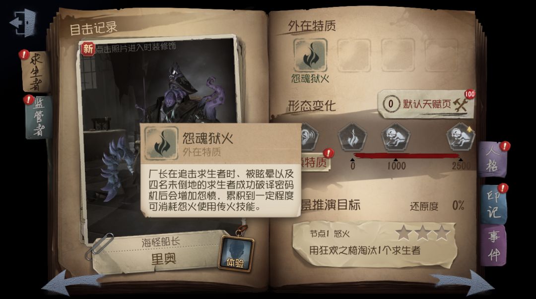 ① 厂长新增 外在特质【怨魂狱火】 ,厂长在追击求生者、被眩晕以及四名未倒地的求生者成功破译密码机后会增加怨愤,累积到一定程度会形成怨火,消耗怨火可使用传火技能;