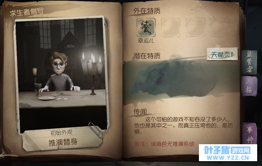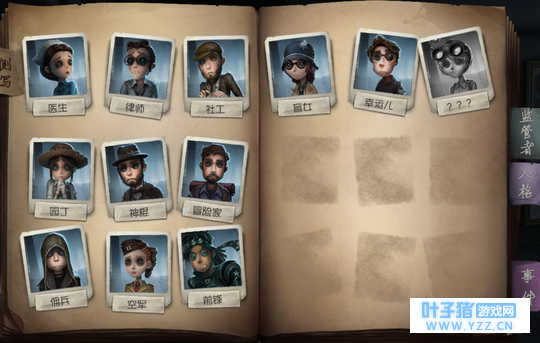 逃生者图鉴 刚进入游戏的时候,通过新手教程,会获得“幸运儿”、“社工”、“律师”、“医生”还有“园丁”。 幸运儿: