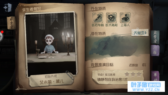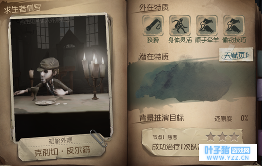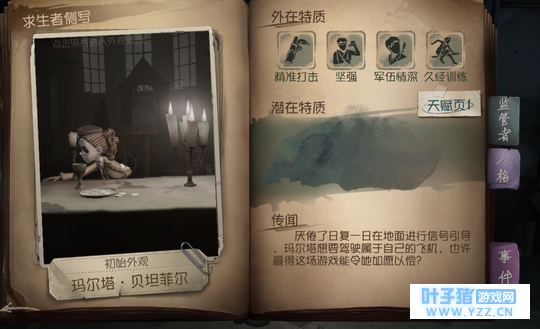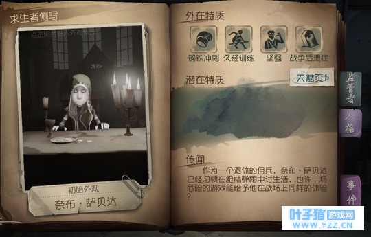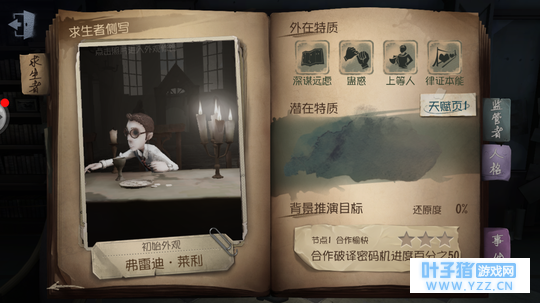 随身携带治疗针,可以自己使用,救助队友有buff,“上等人”是翻窗跑动的debuff。 当然,以上人物的某些技能是对队友也有影响的,比如社工的debuff,是会让队友解码校准率上升눈_눈园丁、盲女会提高解码速度ヽ(○^㉨^)ノ♪等,就不在多说。 另外,通过加成人格,也可以过的技能。有4个天赋页,可以加成不同的人格。 以上道具在游戏中可以通过开箱获得,而其中特殊人物在使用自己道具时没有消耗,或者有buff。 点击图册人物图鉴,可以更改外观等,这些大家就自行体会好了(●°u°●) 」