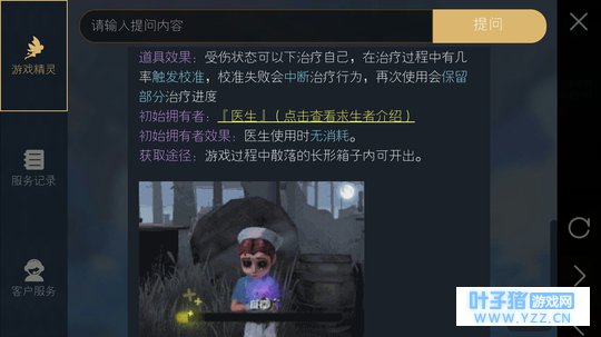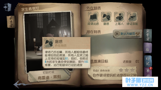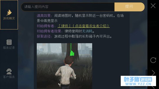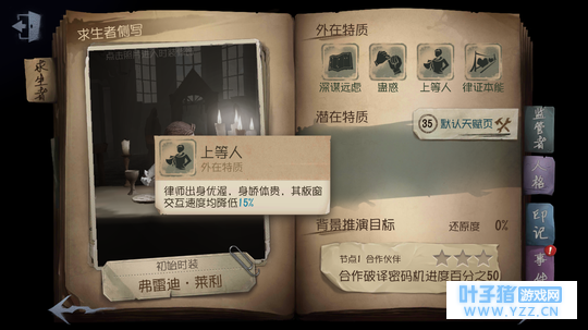 板窗交互会减少15%,被监管者套路的话很容易被恐惧震慑。特别是失误出现慢翻的情况下,交互的时间增加15%可能被恐惧震慑 医生总体来说有独立面对监管者的能力,在溜监管者的过程中如果受伤可以转点到无敌点,利用残余时间治疗自己,不依赖队友,在单人匹配中是一个不错的选择。 3. 律师:律师是一个比较依靠团队的角色,本身自带的debuff以及没有能直面监管者的道具和技能让他很难独自面对监管者。
