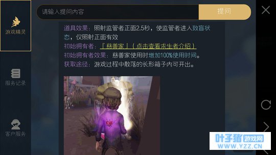 在熟悉熟悉密码机的位置以后这个角色一般就不需要再使用了。蛊惑这个技能适合车队一起修机的速修(但实际效果不佳),相较于其他角色,律师的技能比较鸡肋,这个角色在熟悉地图后毫无作用。新手初期可以用一下,能找到密码机就不需要了。 4. 慈善家:慈善家开局自带手电筒,能照瞎监管者。
